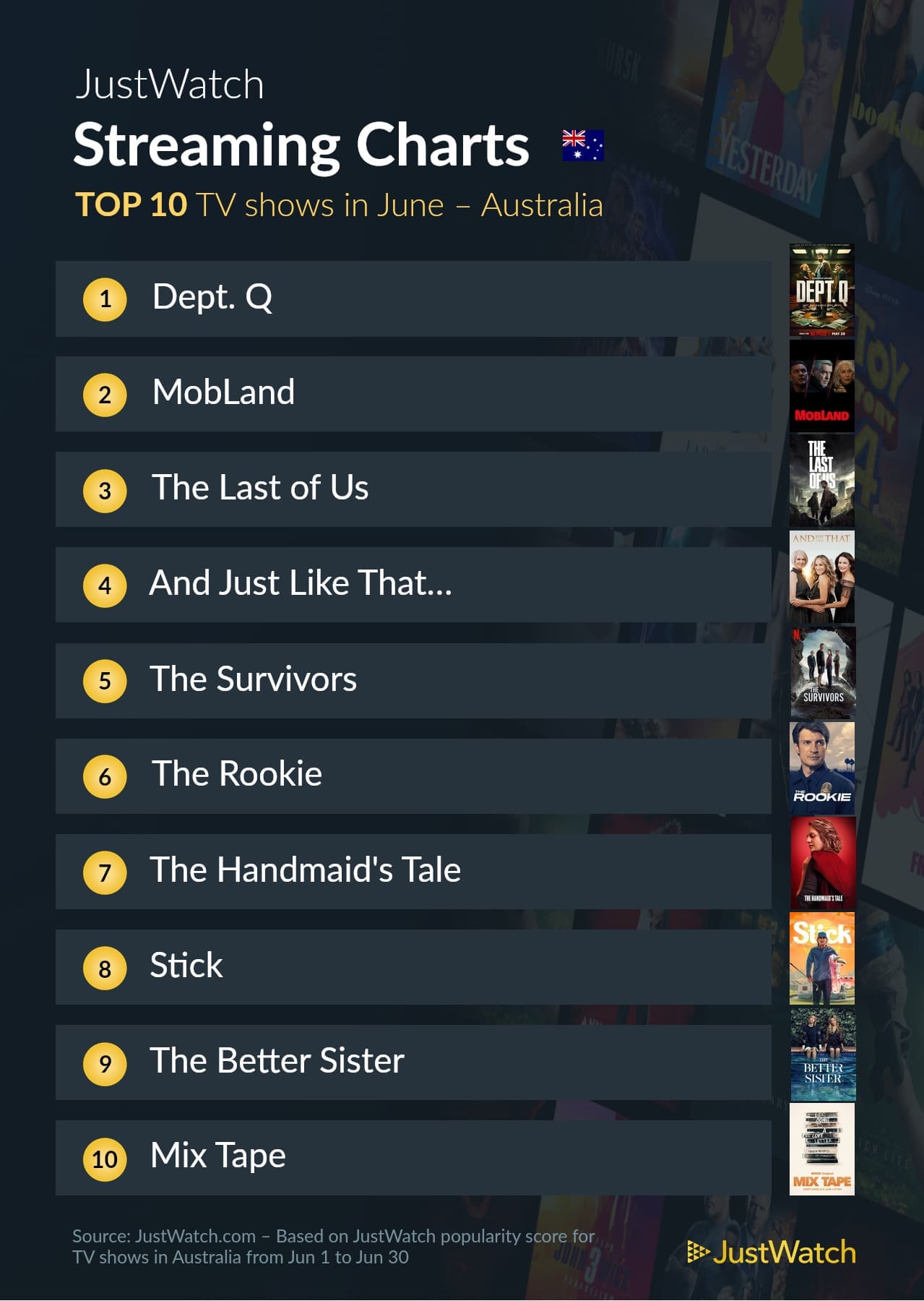 Another new series that did very well in June was MobLand, which was a huge success for Paramount+. With the stellar cast of Tom Hardy, Pierce Brosnan, and Helen Mirren, there was plenty of star power to carry it forward, and the weekly release schedule seemed to keep it near the top of streaming charts for two months in a row.