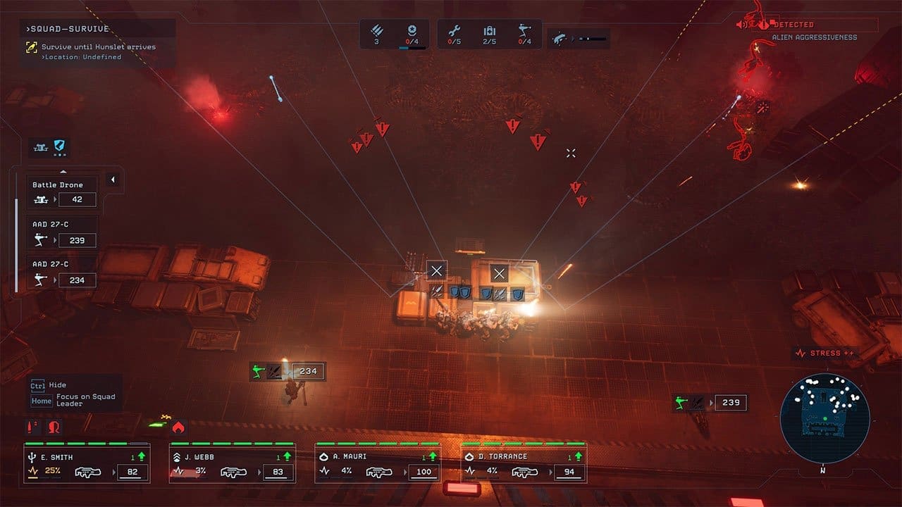 You don’t want to engage in combat constantly, even if you are a squad of Marines. A bar at the right-hand side of the screen will let you know the current difficulty of the Aliens and warn of incoming mass attacks. The more you fight, the more that bar will rise and the more complex the levels become. There are no extra rewards for being as stealthy or loud as possible on missions to push players towards a particular play style. It’s simply a difficulty thing.