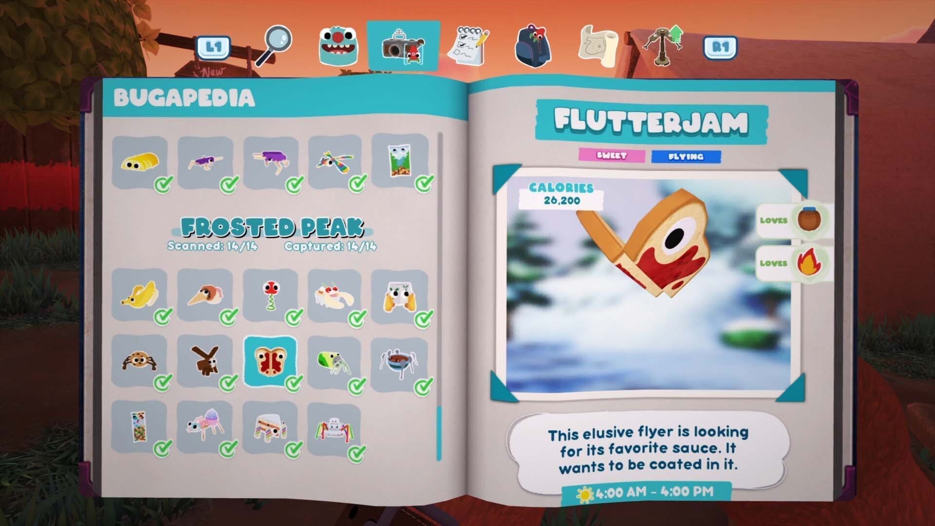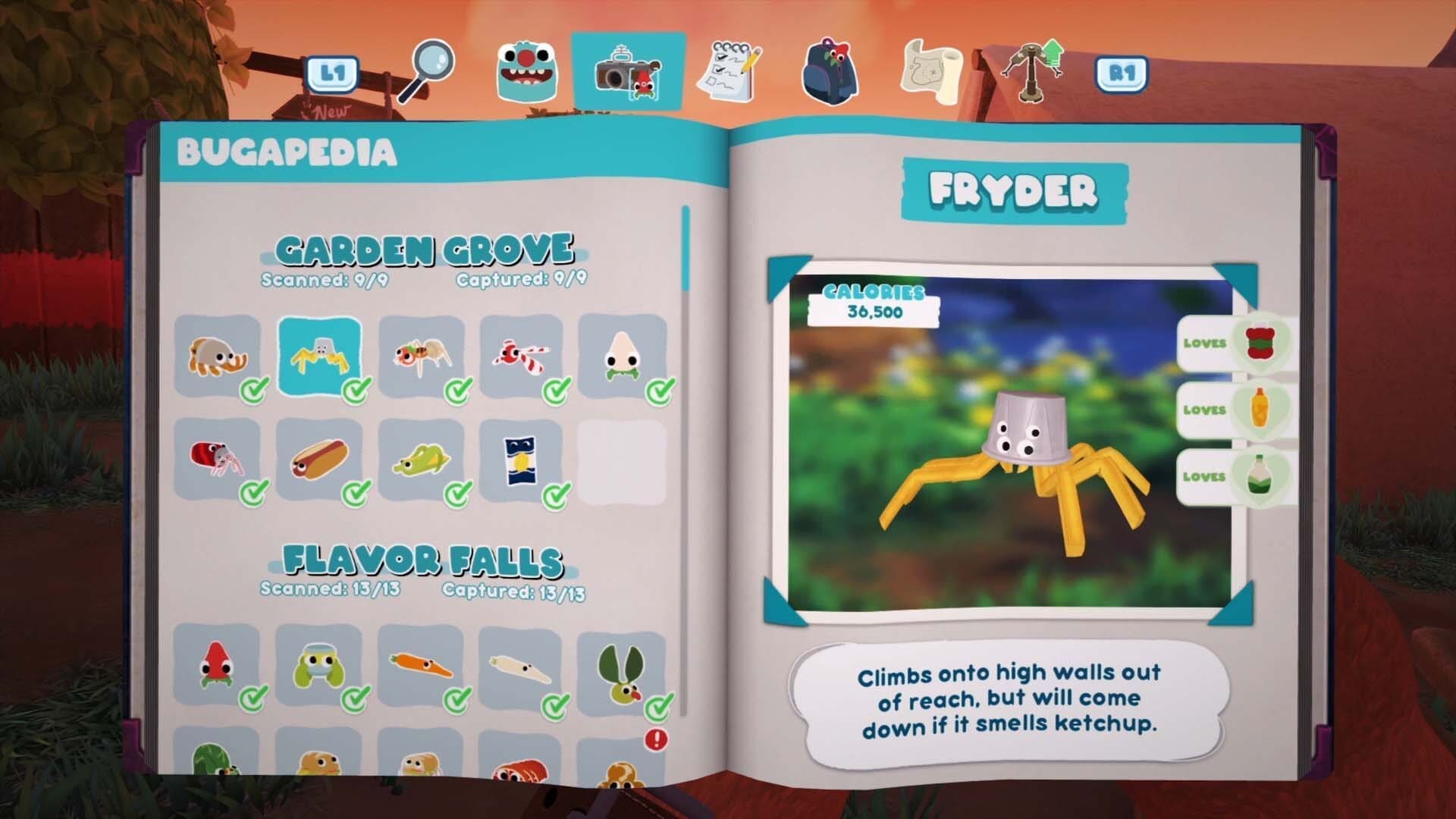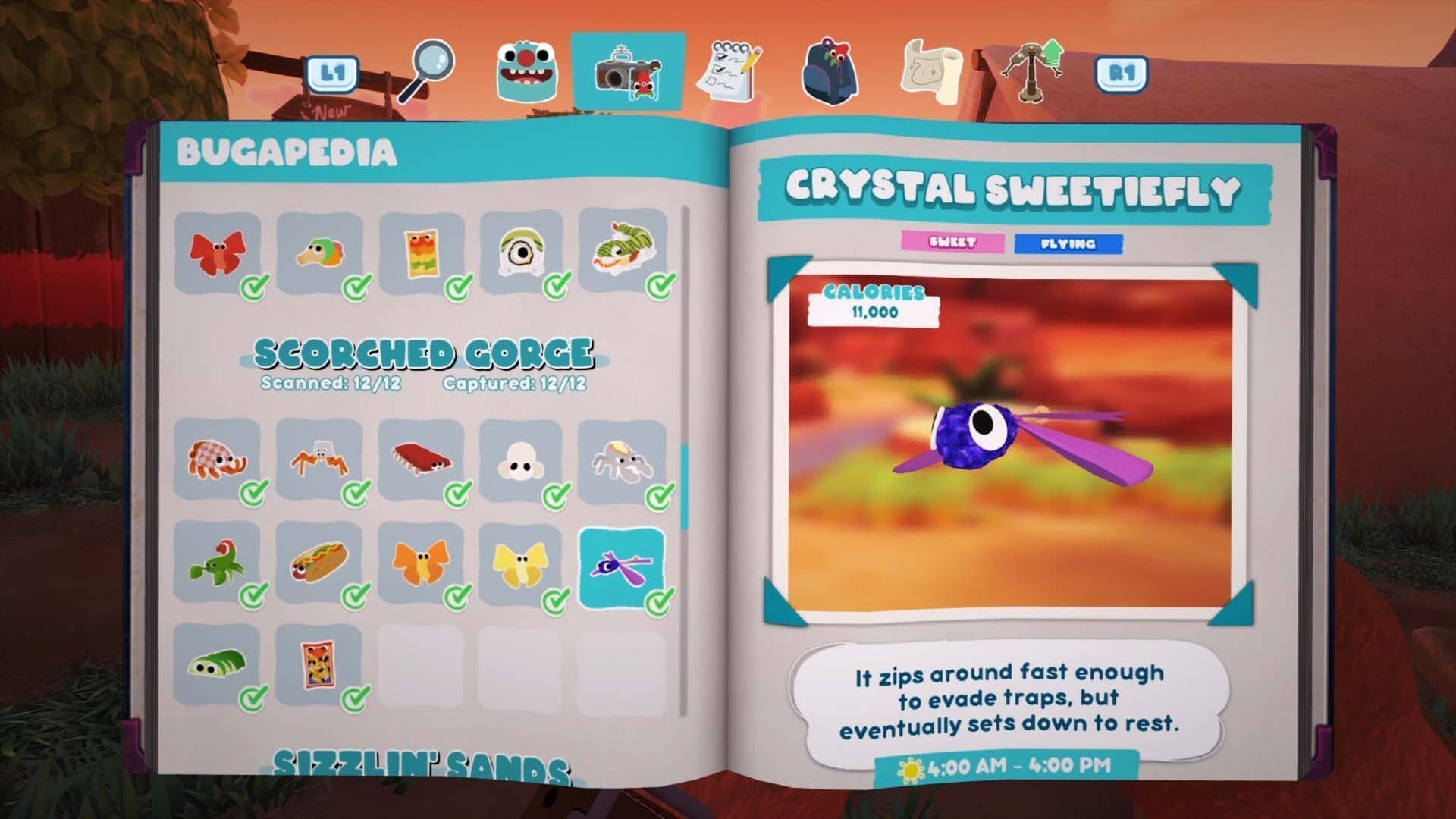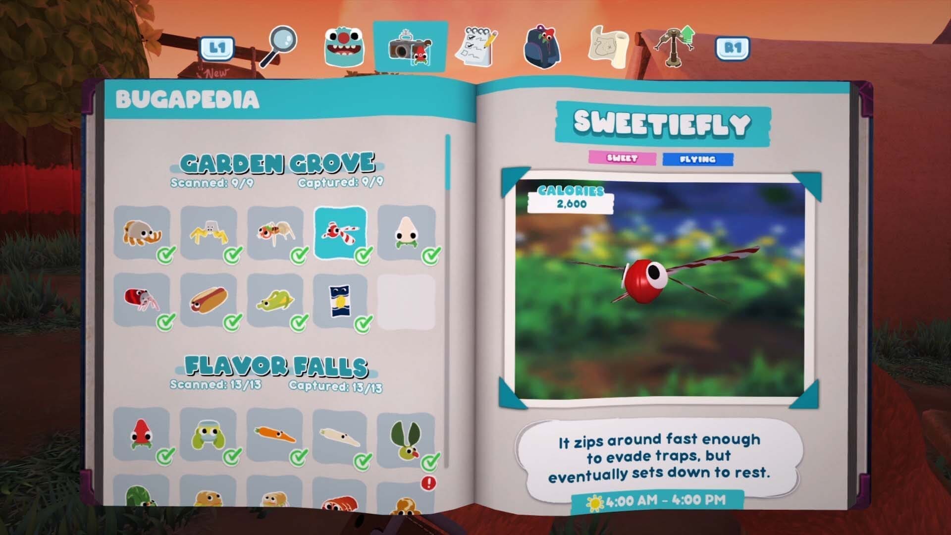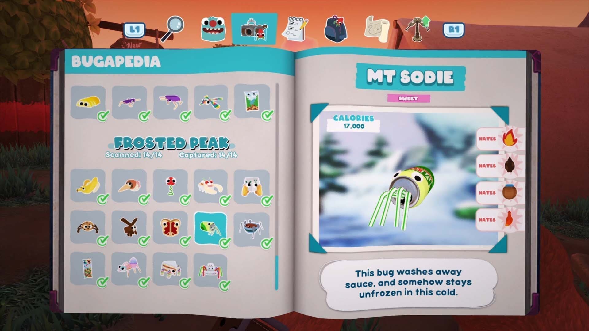 The majority of these are pretty self-explanatory and you won’t need help finding or capturing them, but for the harder one’s I’ve listed some tips. Each page of the Bugapedia lists what sauce each Bugsnax likes and if they only come out at a certain time of day.