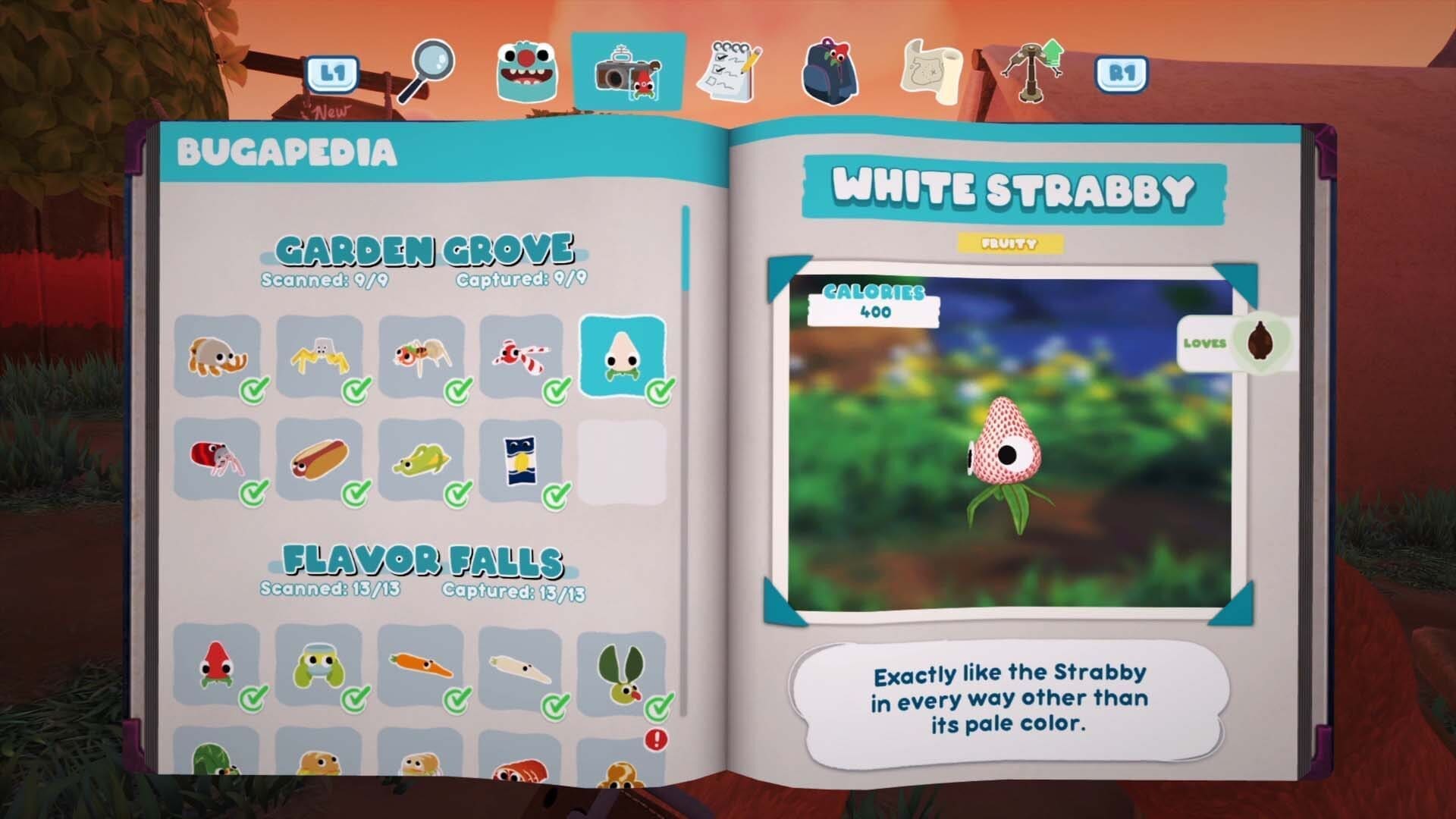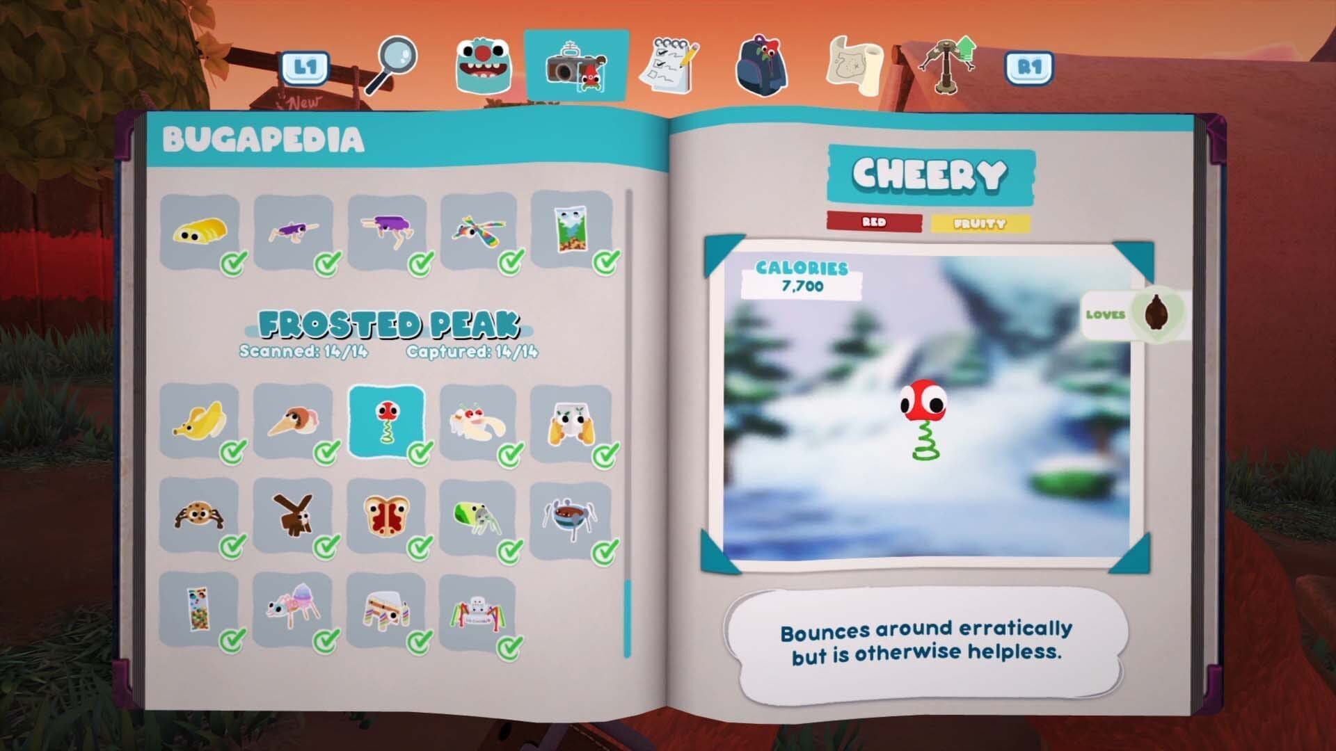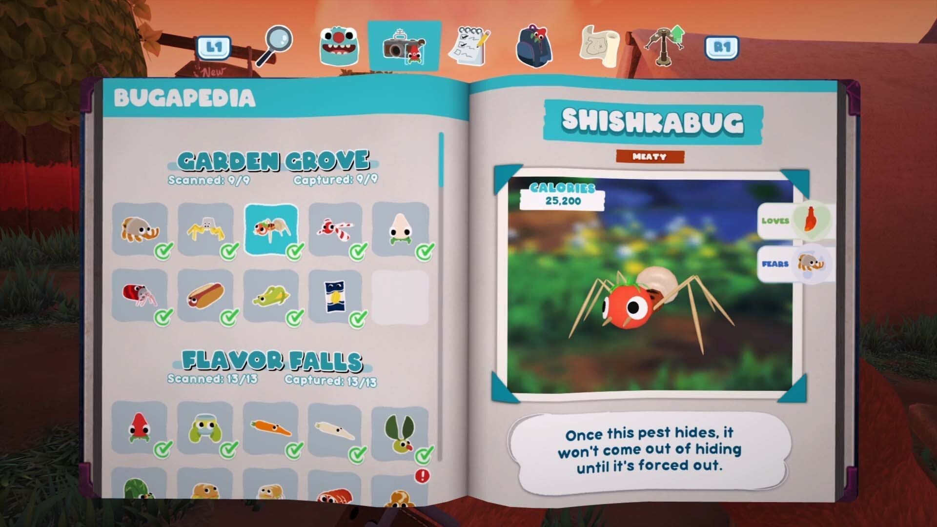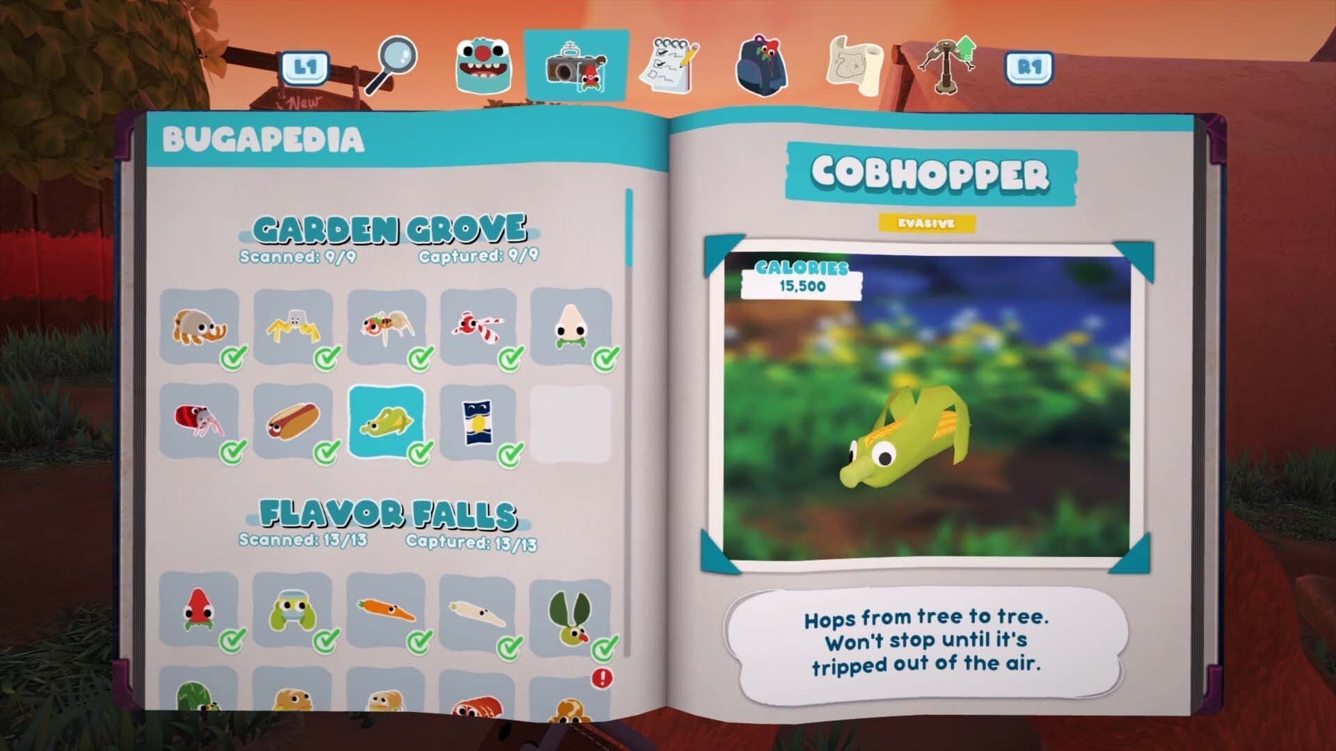 The majority of these are pretty self-explanatory and you won’t need help finding or capturing them, but for the harder one’s I’ve listed some tips. Each page of the Bugapedia lists what sauce each Bugsnax likes and if they only come out at a certain time of day.