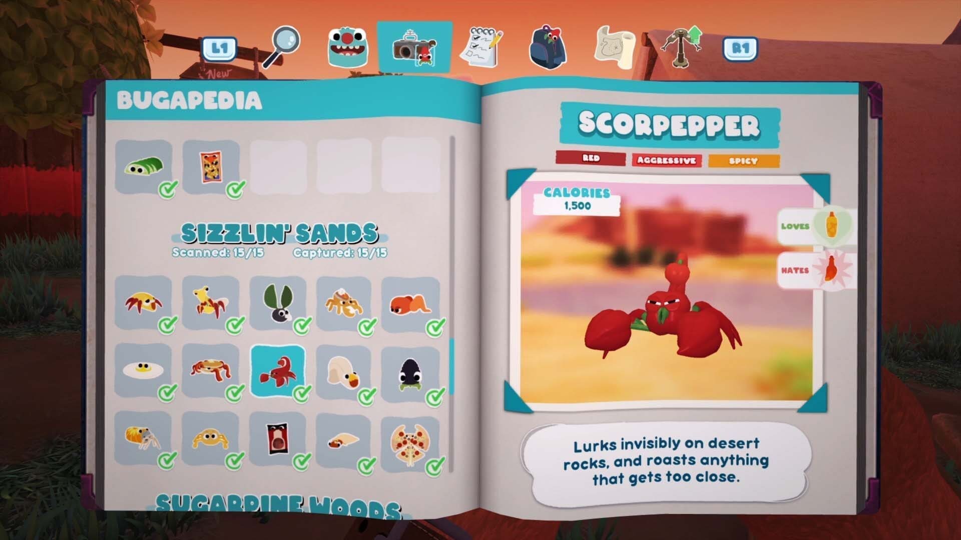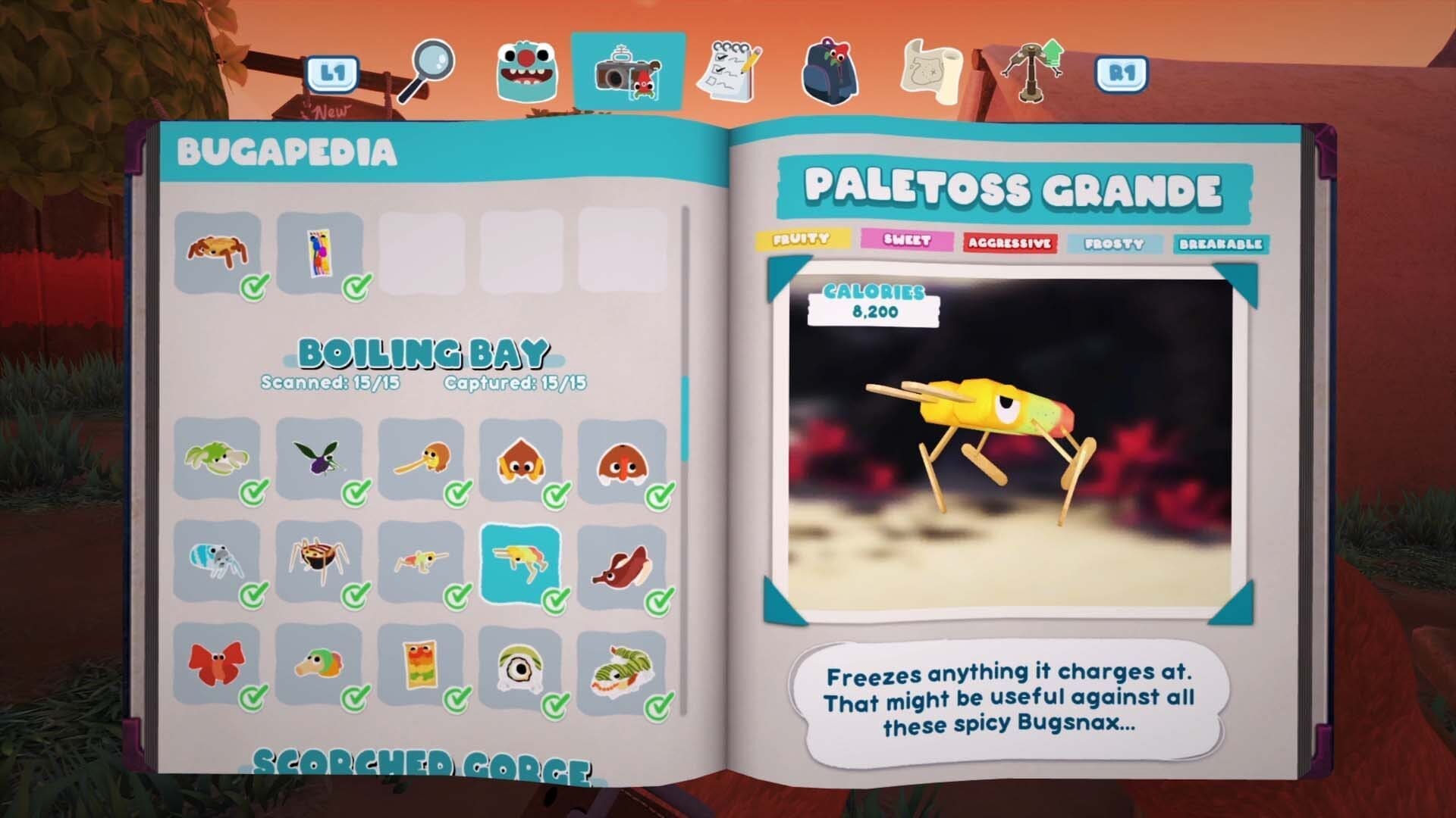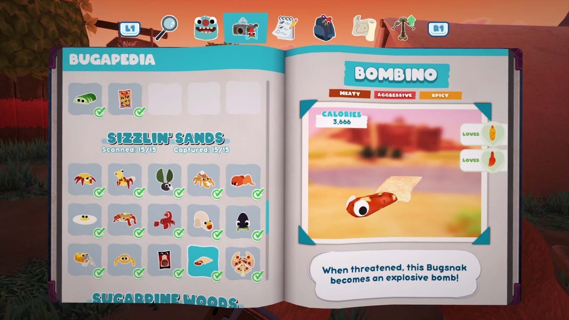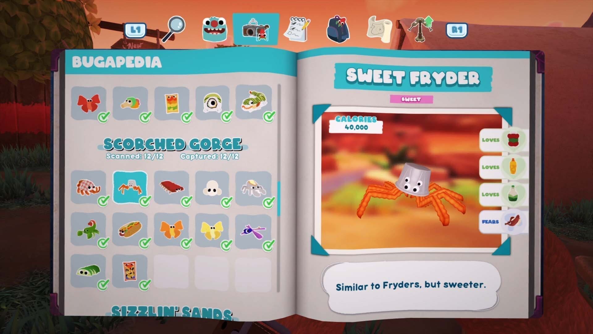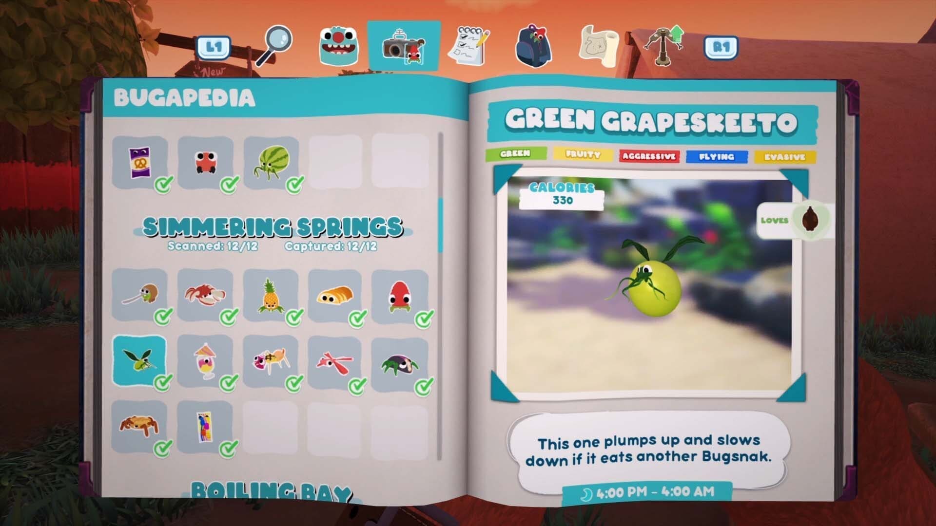 The majority of these are pretty self-explanatory and you won’t need help finding or capturing them, but for the harder one’s I’ve listed some tips. Each page of the Bugapedia lists what sauce each Bugsnax likes and if they only come out at a certain time of day.