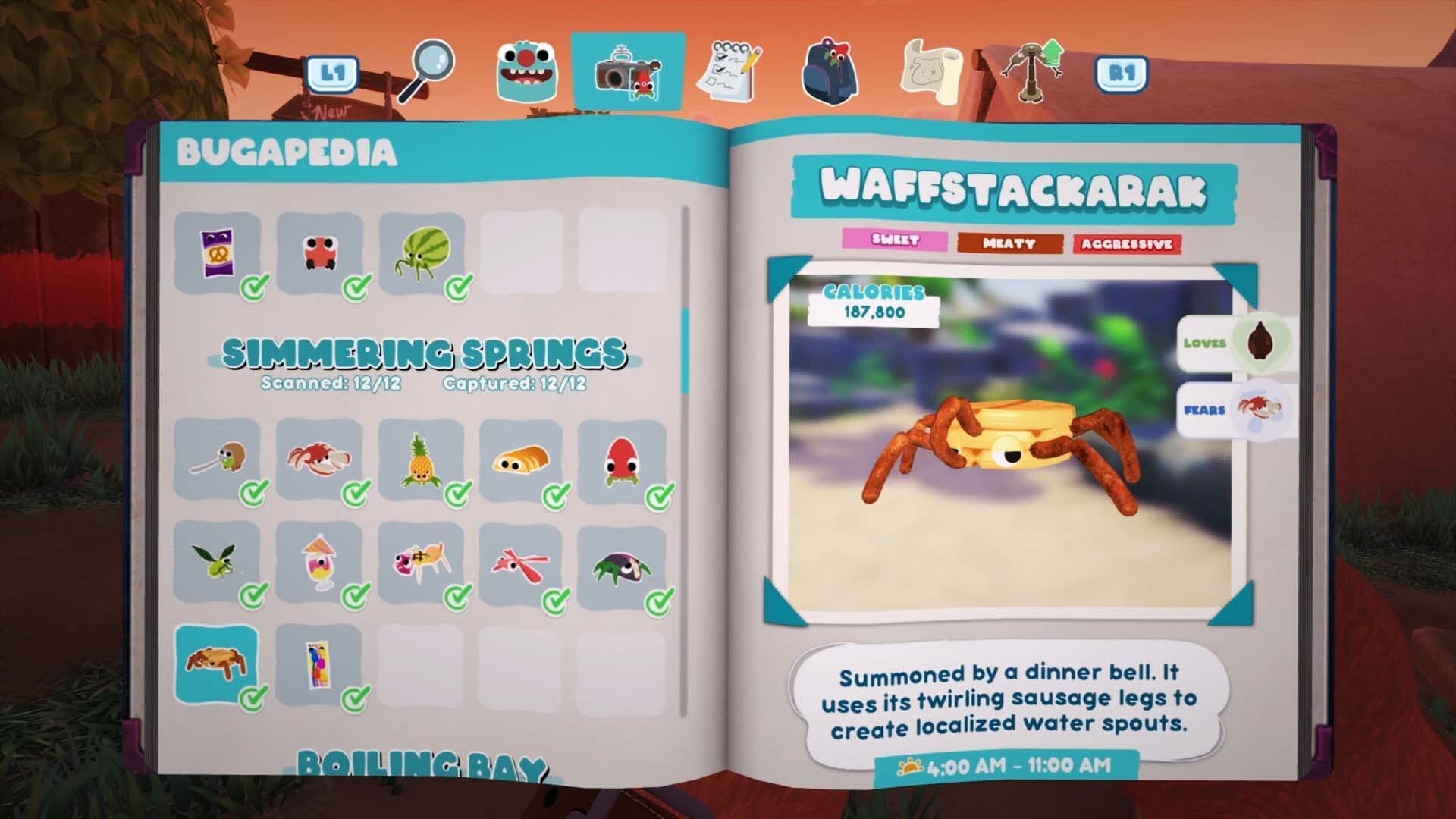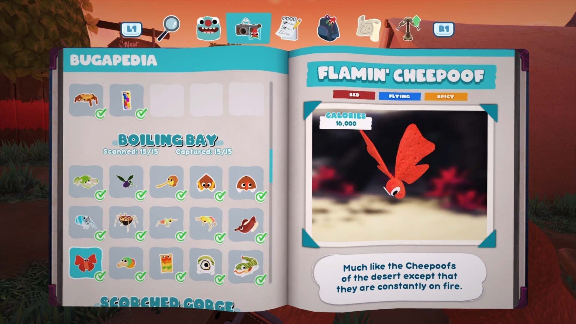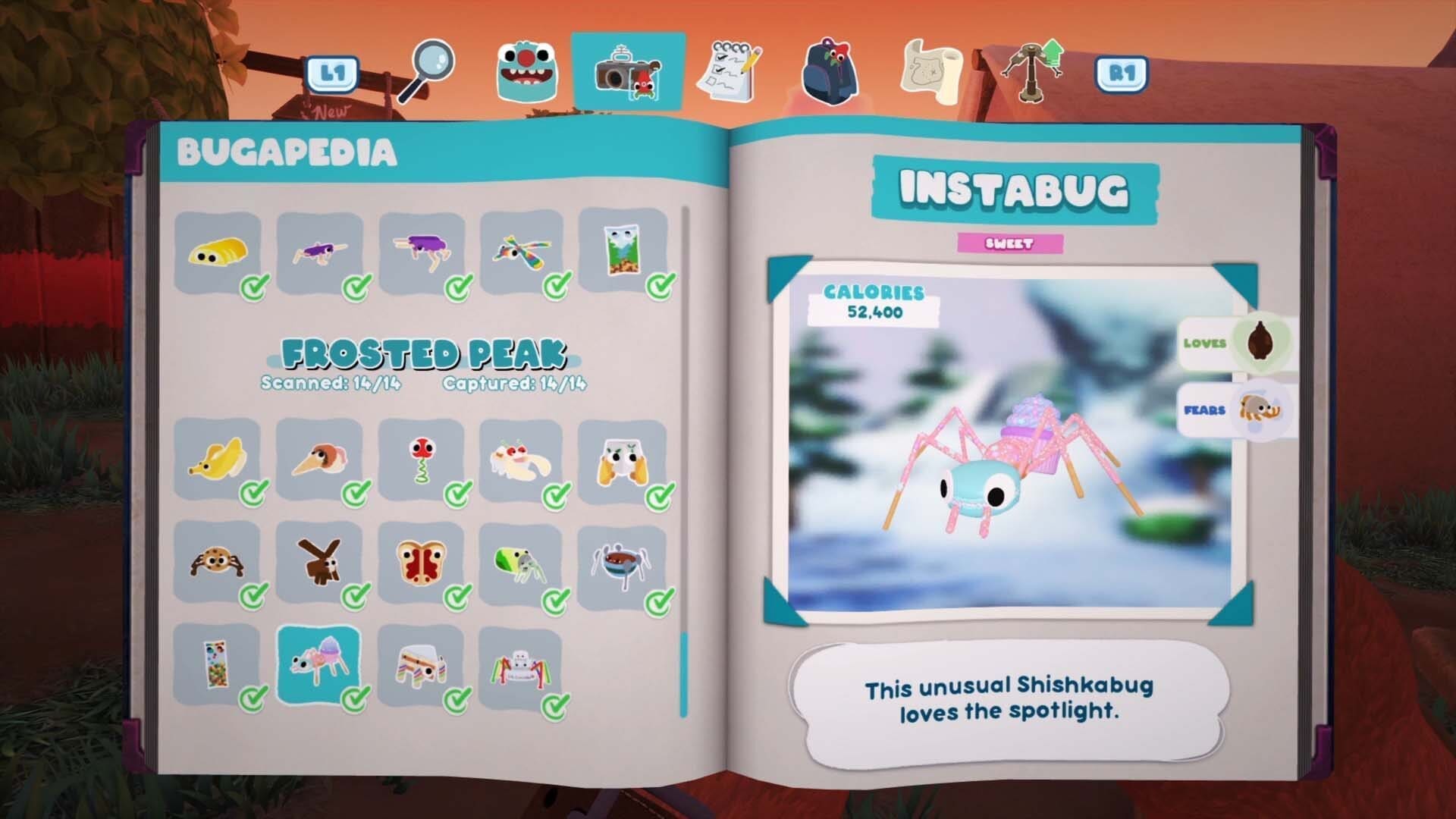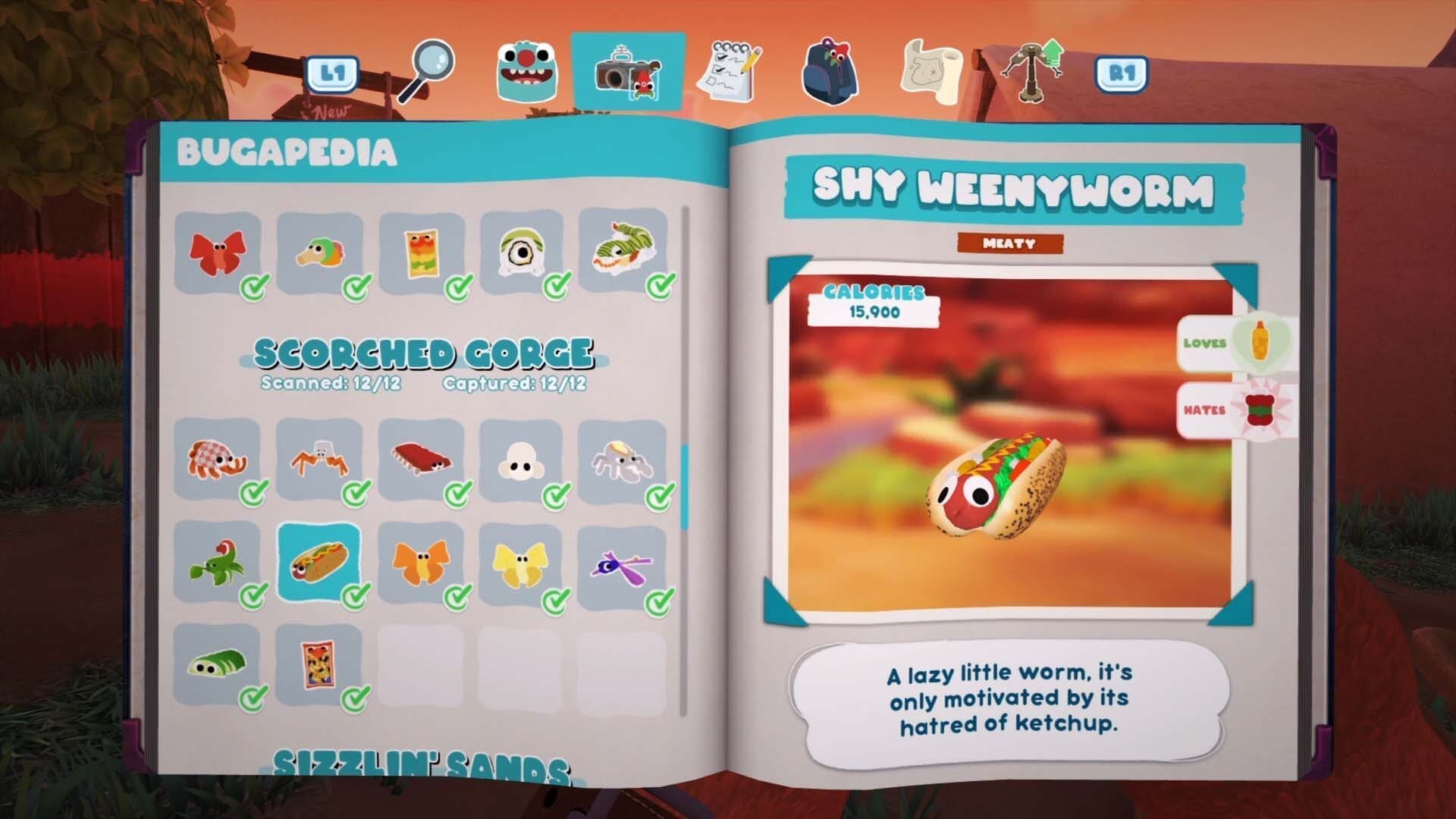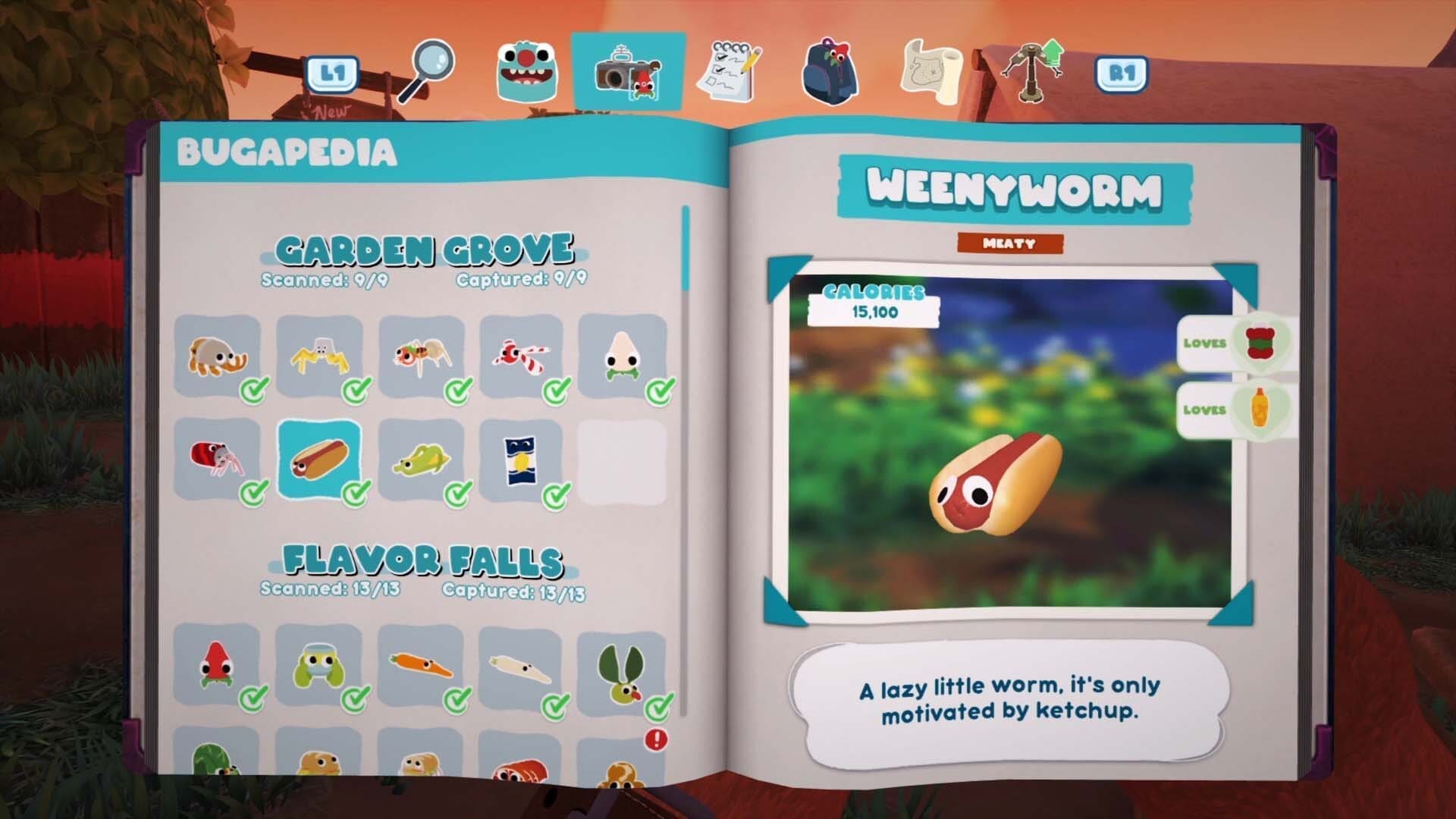 The majority of these are pretty self-explanatory and you won’t need help finding or capturing them, but for the harder one’s I’ve listed some tips. Each page of the Bugapedia lists what sauce each Bugsnax likes and if they only come out at a certain time of day.