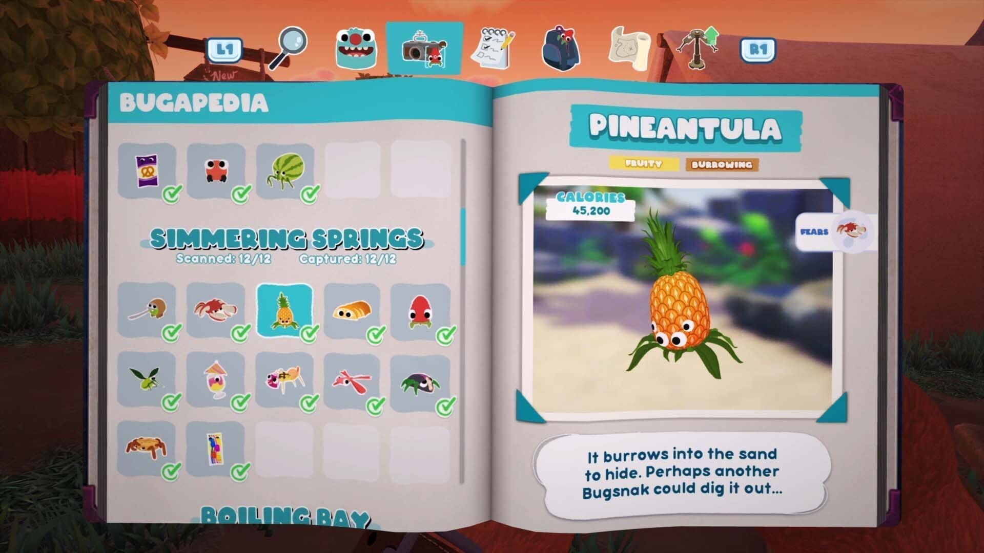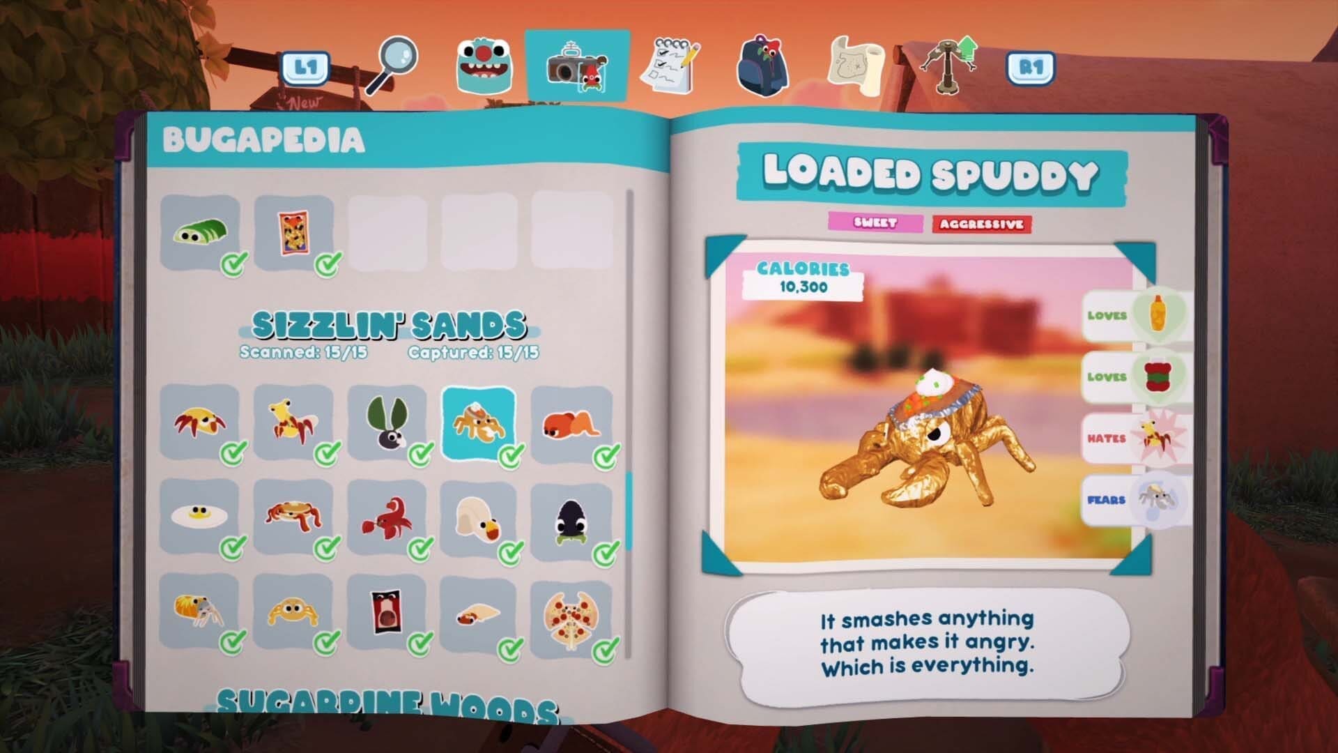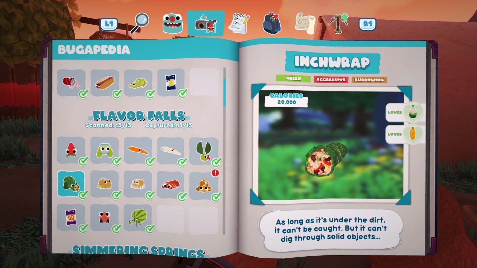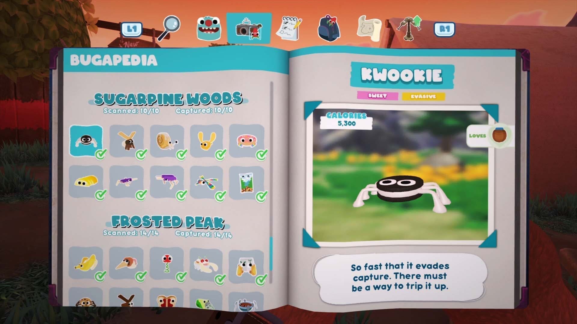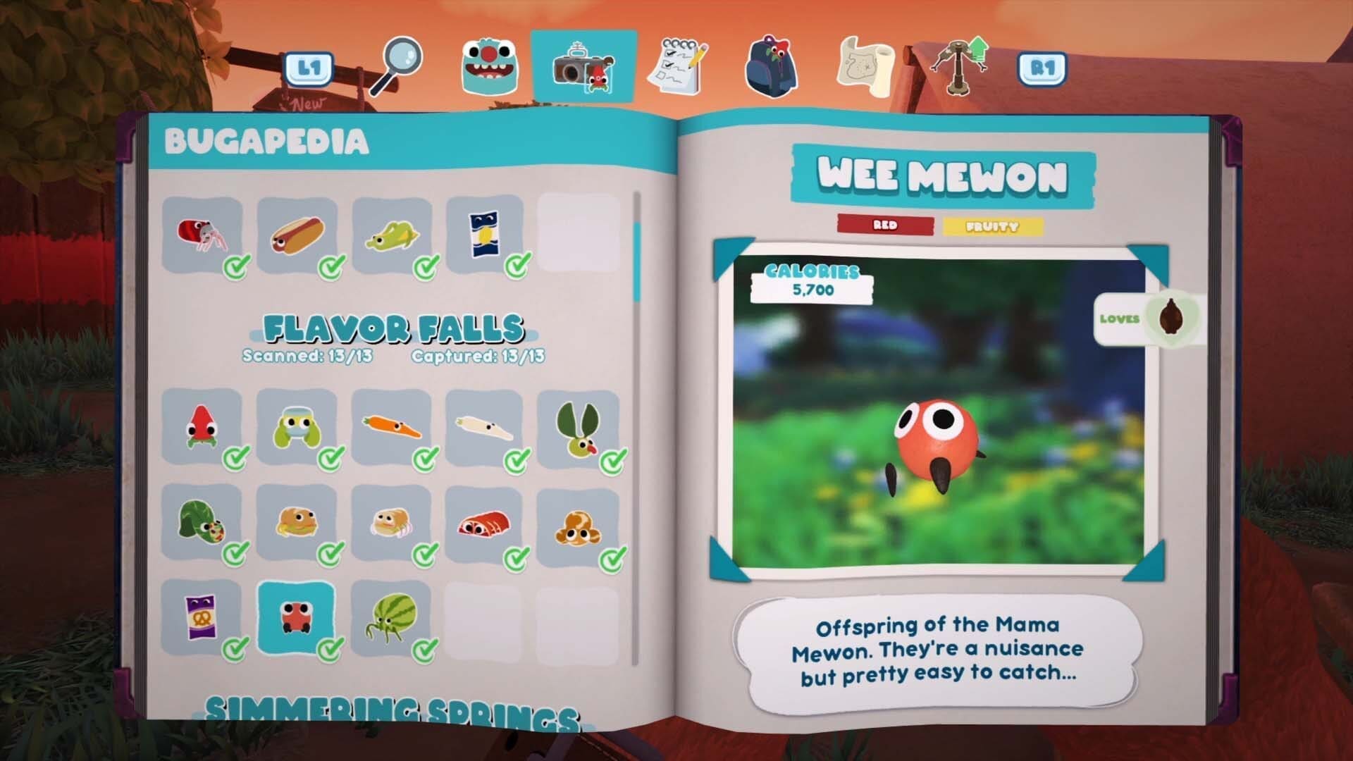 The majority of these are pretty self-explanatory and you won’t need help finding or capturing them, but for the harder one’s I’ve listed some tips. Each page of the Bugapedia lists what sauce each Bugsnax likes and if they only come out at a certain time of day.