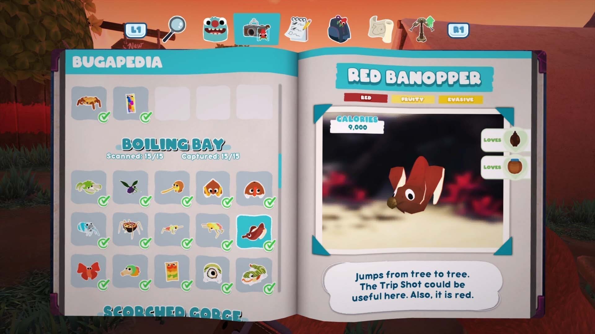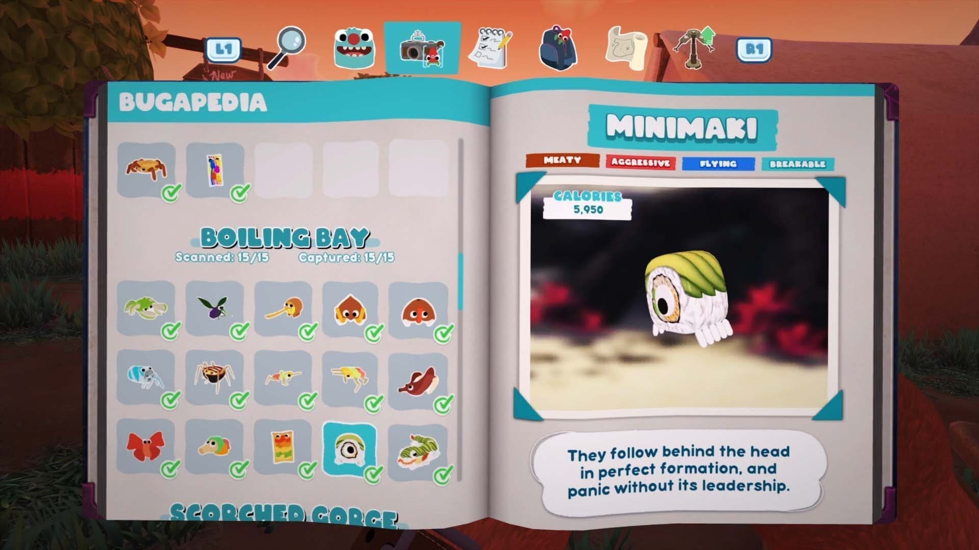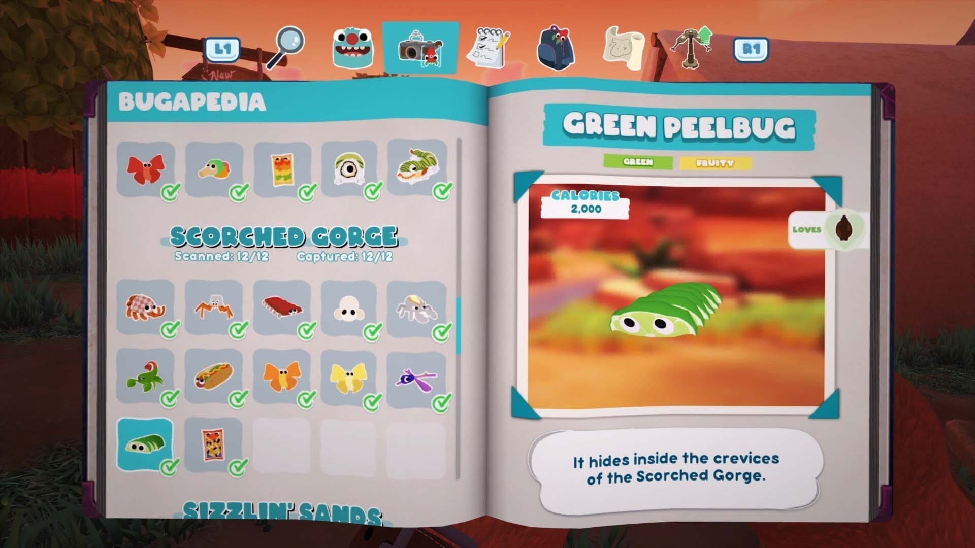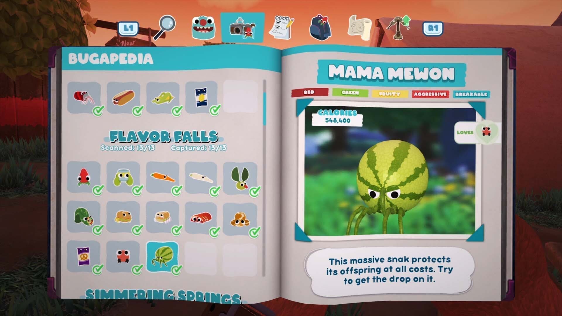 The majority of these are pretty self-explanatory and you won’t need help finding or capturing them, but for the harder one’s I’ve listed some tips. Each page of the Bugapedia lists what sauce each Bugsnax likes and if they only come out at a certain time of day.