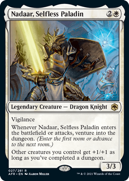 When you reach the final room, you complete that Dungeon, which is good news for cards like Nadaar, Selfless Paladin as it states, “other creatures you control get +1/+1 as long as you’ve completed a dungeon.”