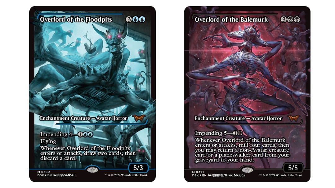 Playing into the horrific nature of some of the creatures you could come across while exploring the Duskmourn Manor, the ‘Mirror Monster’ cards are alternative art that features the monsters only seen through a mirror in that art. This plays into some great monster movie tropes and classic movie moments.