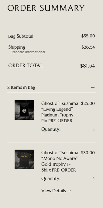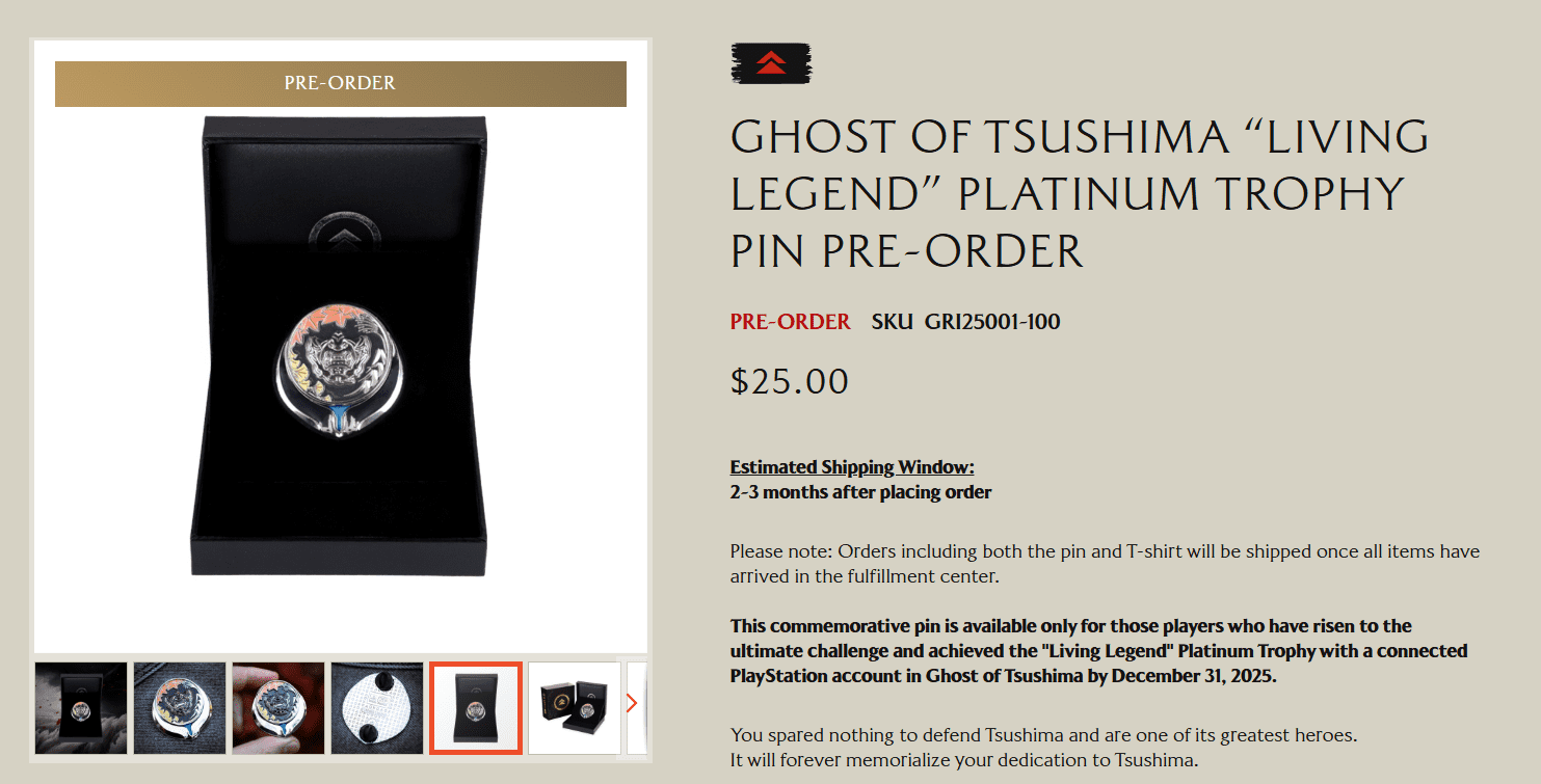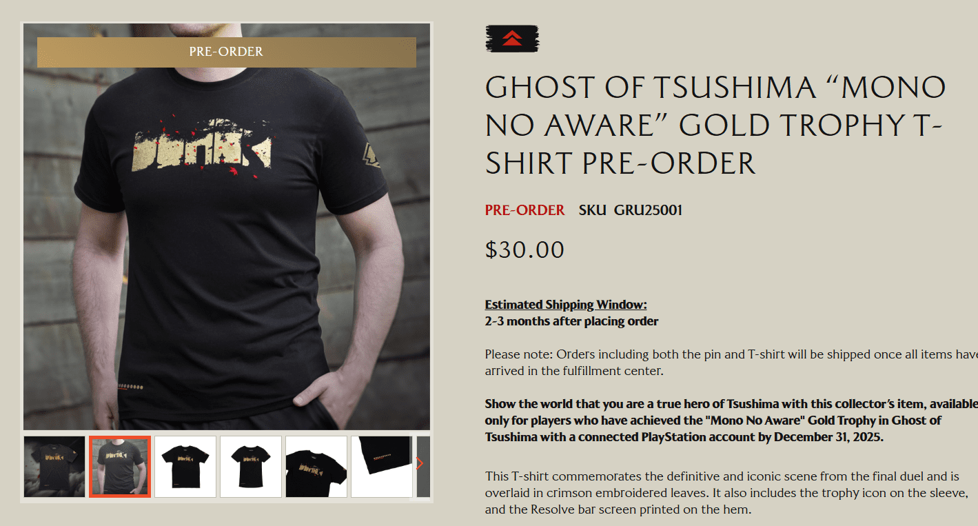 The first two rewards are a t-shirt and a pin that can be purchased if you unlock the “Mono No Aware” Gold or “Living Legend” Platinum trophies in Ghost of Tsushima by December 31, 2025, by heading to https://ghostrewards.playstation.com/.