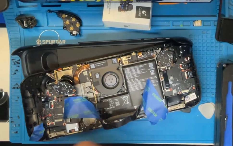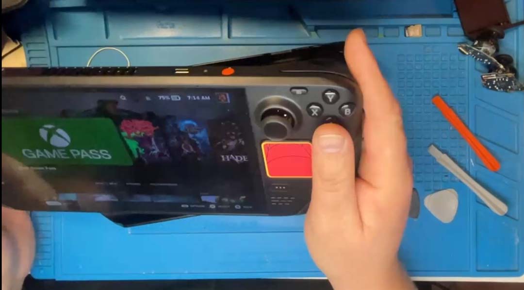 With a clean desk and tools at hand, I stripped the Mod Case off the Deck and pulled the SD card, and I had to use a utility knife to trim the previously installed grips so that the rear panel could be removed. Using a Torx 6 screwdriver head, I removed the eight screws from the rear and then used the pry tool to remove the back. Notably, it was harder than the previous model, but with a slight effort, I got it off. From here, it was time to work on the left side, placing the device on the front cover of the mod case to ensure that the joysticks and screen were not damaged during this modification. I removed the screws around the shielding and made sure to pull the battery cable.