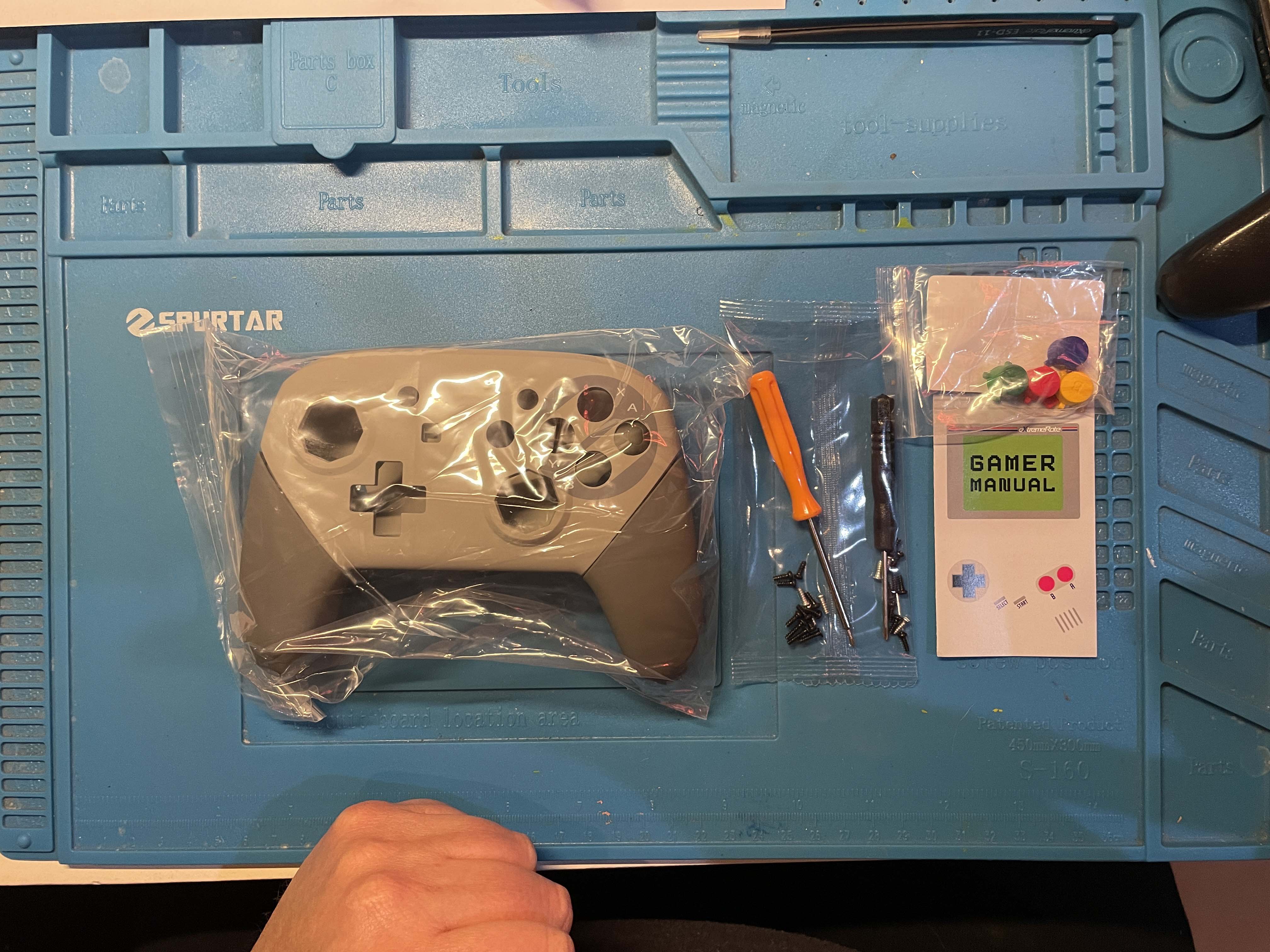 Of the items I received from Extreme Rate, this was the easiest modification because the controller was easy to pull apart, and the process was straightforward. While I made a few mistakes, the overall process took about half an hour, and the controller functions and feels new. I started by laying the component of the box on my desk, including the shell, a full set of screws, and two screwdrivers. There is a guide on the manufacturer’s website, but I tackled this mostly without it, only using it in a couple of spots to check my progress or screw placement when putting the device back together.