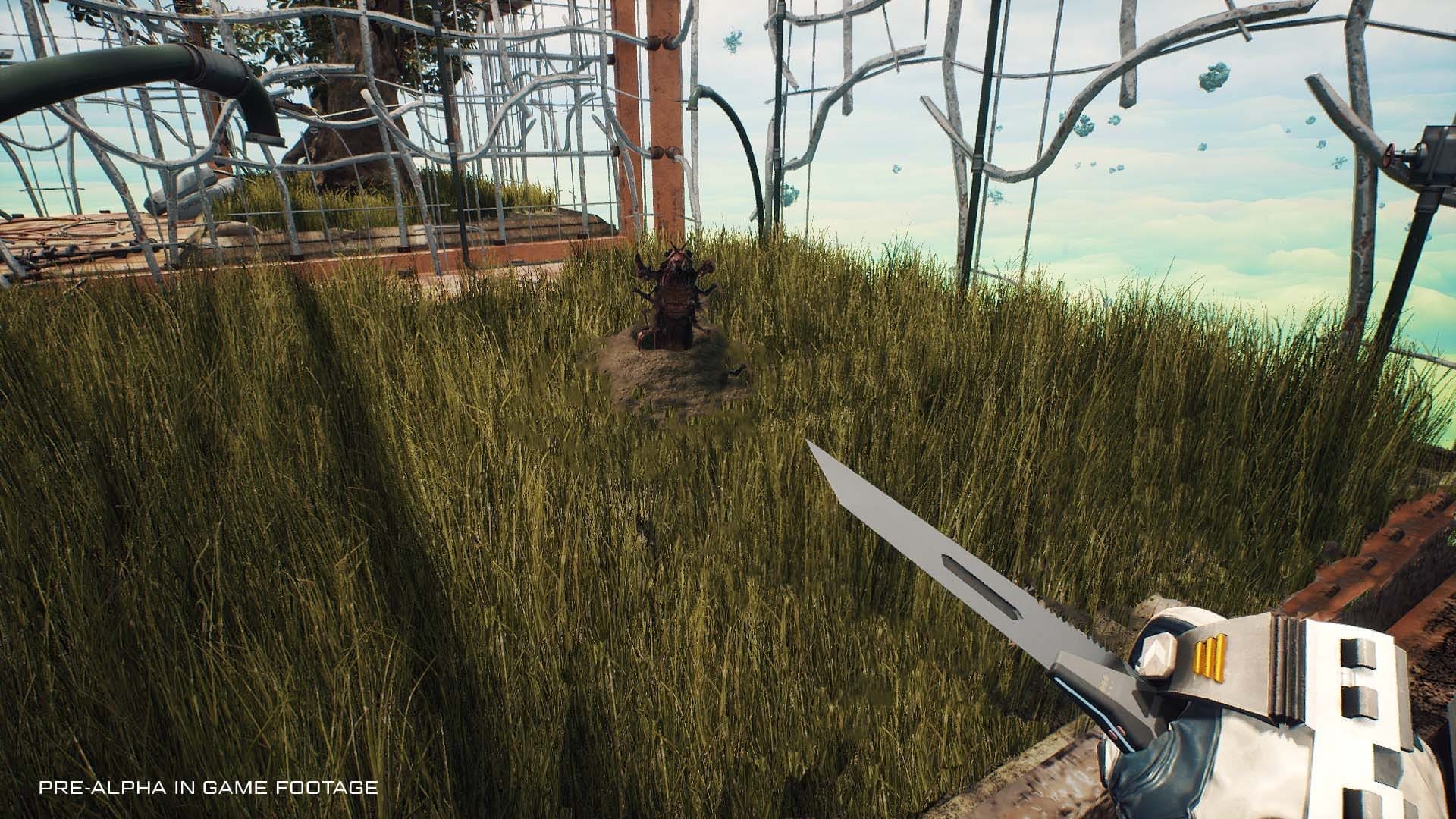 Nearby was a damaged engine for your airship, but thanks to the trusty scanner, I could scan its blueprint to be recreated in my Fabricator. With the materials gathered for this, I had also built a few other staples – a lure to catch some of the mutated denizens from under the dust that acted as an automated fishing line, a cooking station to improve their returns as well as all the components to collect and purify some water. This was all to help manage the four main survival systems; Thirst, hunger, health and stamina. I also encountered a Virus from some of the old fruit I ate that resulted in the scorching sun burning me more than usual until I had found the cure, conveniently a different kind of fruit nearby. These systems required much managing throughout the sixty-minute demo and weren’t anything I would easily forget.