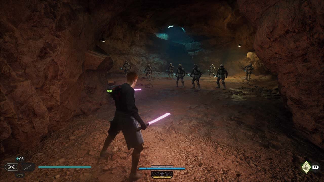 The variety of enemies in Star Wars Jedi: Surivor feels similar to Fallen Order’s. Small creatures can pose just as significant a threat to your health as bigger ones if you’re not careful. Stormtroopers range from easily deflectable standard blaster troopers up to returning Purge Troopers. The addition of classic B1 prequel-era droids makes for lightsaber fodder but funny lines of dialogue. At the same time, the raiders bring the most significant challenge this time with new battle droids under their control and plenty of enemies with vibro-blades and other weapons that can fight back against Cal’s lightsaber.