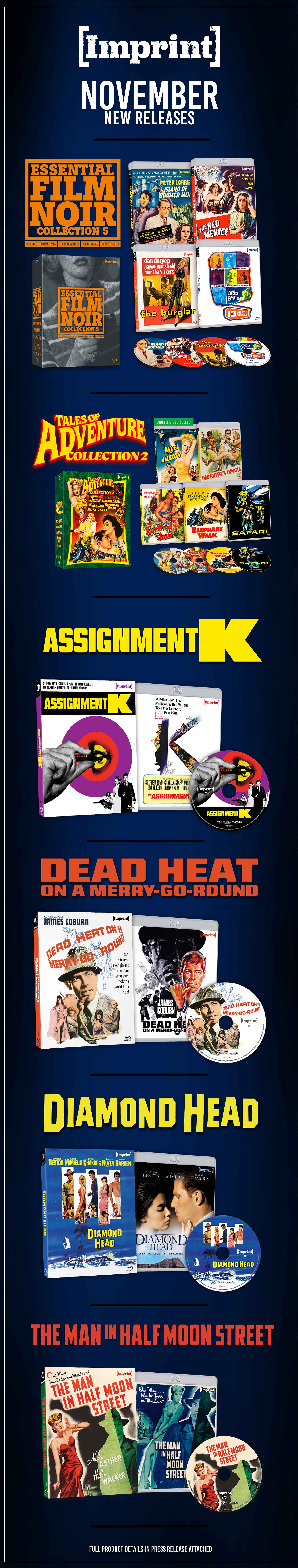 This month’s releases feature 13 films, and 11 of those are worldwide Blu-ray premieres. An interesting film in the list of films this month is Dead Heat on a Merry-Go-Round, which stars James Coburn but also has Harrison Ford in his first film appearance.
