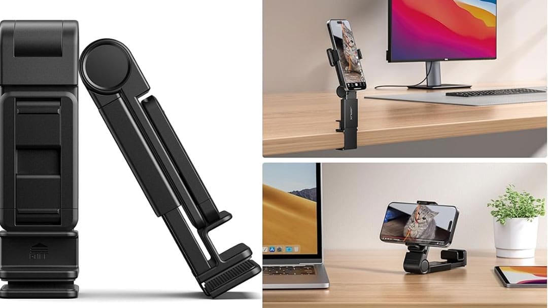 The folding travel stand from JSAUX is a pocket-sized mobile travel stand. A handy device for persons on the move who want hands-free phone use. It is a great companion in many situations, from cars to flights and everywhere in between, as it easily mounts and unmounts from desks and items.