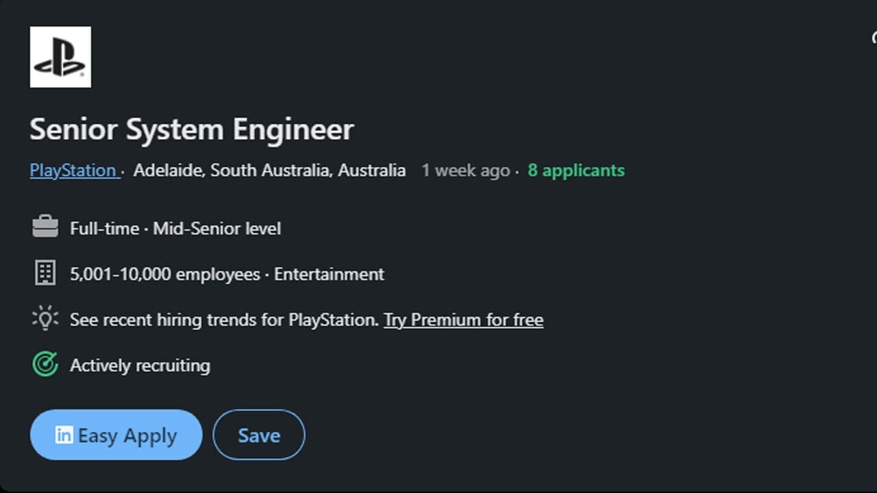 Another job listing was posted just a week ago for a Full-time Senior System Engineer at PlayStation Adelaide. The description for that job is similar to the one above.