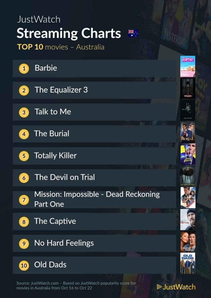 Barbie is still holding strong as we head into the last week of October. Some new Netflix films have made their way into the top ten this week with The Devil on Trial and Old Dads, while some of the horror films seem to have dropped this week between Totally Killer moving down the list and Pearl falling out completely.