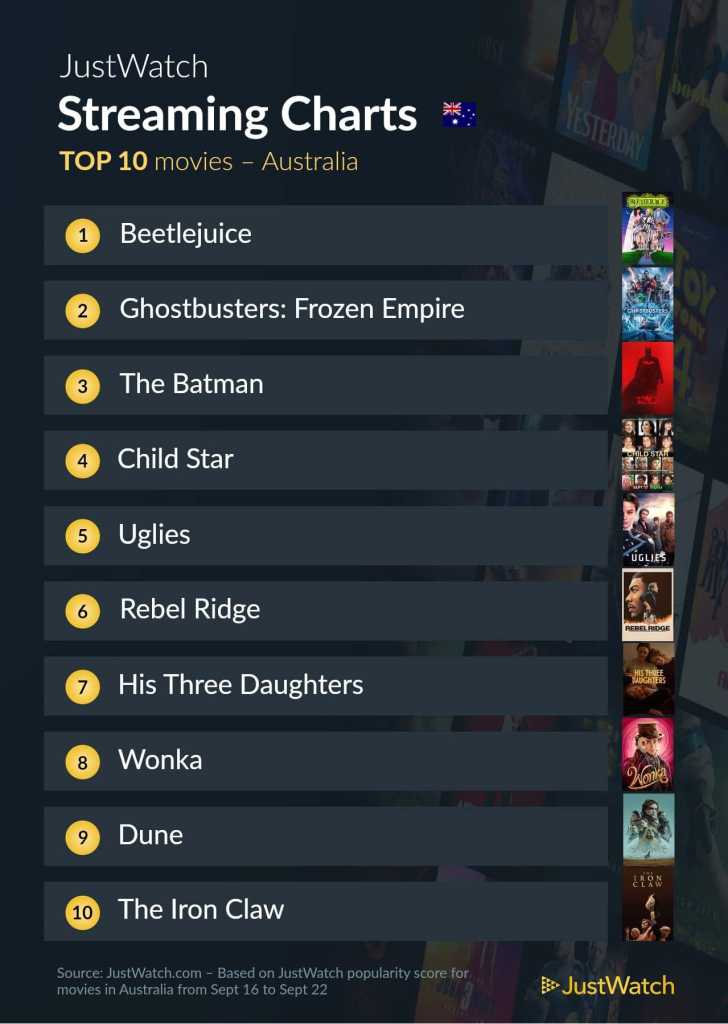 With Beetlejuice Beetlejuice now in cinemas, everyone is rewatching the original film before heading into cinemas. The Batman in third place is also a new entry, presumably because The Penguin debuted on Binge last week.