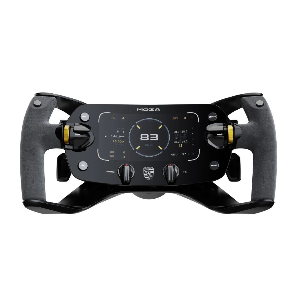 The MOZA Porsche Mission R Steering Wheel is an officially licensed replica crafted with Porsche’s original CAD data. Featuring a 5.4-inch flexible OLED display, CNC-machined aluminium frame, suede-like grips, and dual-clutch magnetic paddles, it delivers the ultimate balance of authenticity, performance, and comfort for professional sim racing.