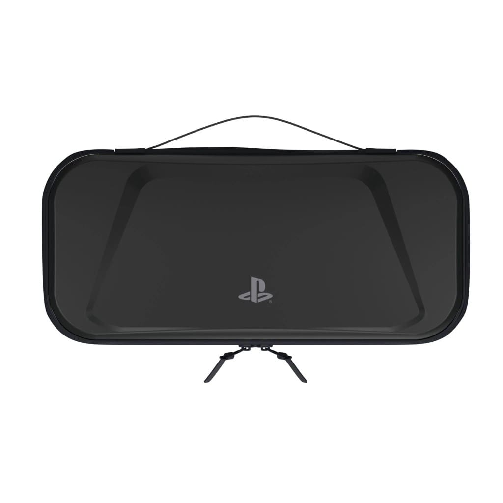 The pass-through for a charging cable allows charging of the PS Portal while the case is closed. Inside, a built-in padded screen protector flap helps prevent scratches on the screen and has a mesh pocket to store small accessories. A top handle allows easy carry while the full-perimeter zipper with dual pulls and lie-flat design make it easy to access.