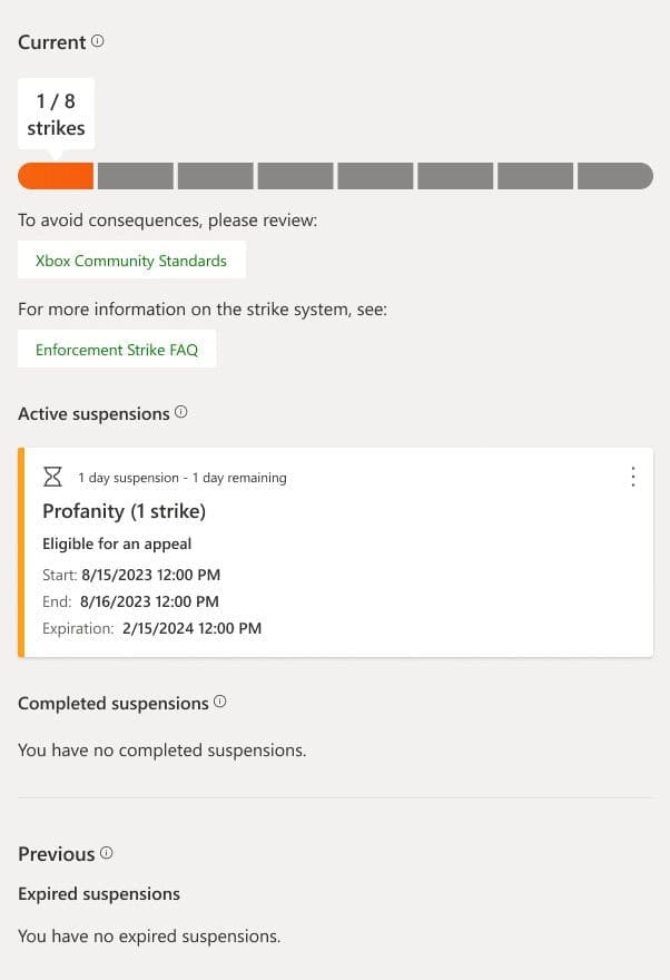 Players will now be able to view the strikes against their account by heading to this page and signing in with their Microsoft account. Players will receive a strike against them for every enforcement of inappropriate activity. A strike will stay on a user’s account for six months. Each of these strikes will also lead to a suspension from Xbox’s social features, though the length of this varies depending on what that player did to get the strike.